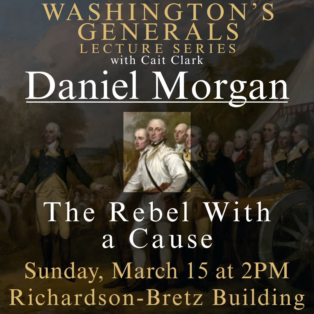 Our second lecture of the Washington’s Generals lecture series is Daniel Morgan: The Rebel With a Cause. The early years of Daniel Morgan’s life are a mystery, but his contributions to the Revolution are not. Plagued by a past of poverty and terrible injuries, Morgan was a rebel long before the war broke out.
