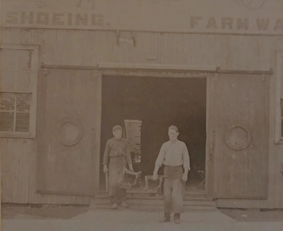 Recently, a package from Yorktown, Virginia, arrived at the Mercer County Historical Society. Upon opening it, we found a picture of two men in front of a barn and a plaque with a hammer and horseshoe mounted onto it. A letter in the box told us the marvelous history of these artifacts.